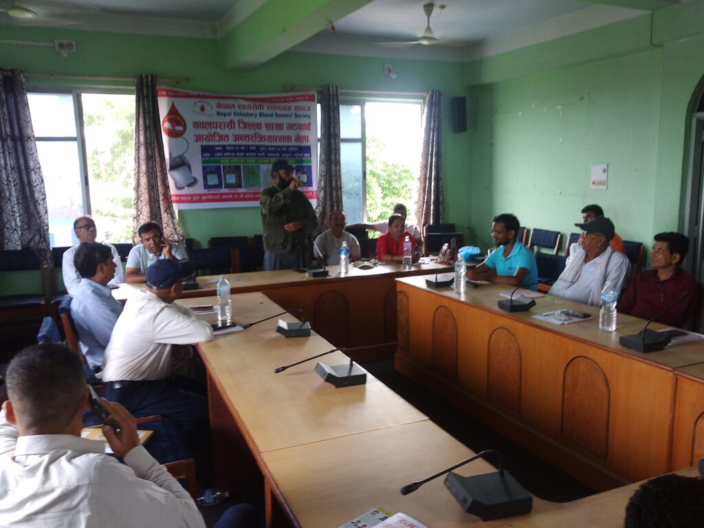 रक्त सञ्चार केन्द्र नवलपरासीका संयोजक सुरज केसीको अध्यक्षतामा भएको उक्त भेलालाई सम्बोधन गर्दै रक्तदाता समाजका केन्द्रीय अध्यक्ष कर्माचार्यले १८ वर्ष पुगेपछि प्रत्येक व्यक्तिले रक्तदान गरी मानवीय सेवामा समर्पित हुन आह्वान गरेका थिए । आफूले हाल सम्म १ सय ८३ पटक रक्तदान गरी स्वस्थ रहेको बताउँदै उनले रक्तदान गर्दा कमजोरी हुने वा बिरामी हुने भन्ने कुरा सत्य नभएको र त्यसको उदाहरण आफू नै रहेको उल्लेख गरेका थिए । रगतको अभावकै कारण कसैको पनि अकालमा मृत्यु नहोस् भन्ने उद्देश्यले रक्तदाता समाजले देशै भरी अभियान सञ्चालन गरिरहेको भन्दै जिल्ला शाखा गठन हुनेमा नवलपरासी ४४ औँ जिल्ला भएको उहाँले जानकारी दिए ।