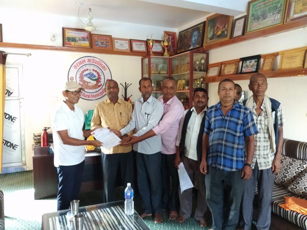 मंगलवार सरावल गाउपालिका प्रमुख शुखाडी प्रसाद चौधरीलाई उतm ध्यानाकर्षण पत्र बुझाउदै आग्रह गरेका थिए । मिटरब्याजसँग जोडिएका कित्ता नम्बर सहितको विवरण गाउपालिकाको न्यायिक समिति र वार्ड कार्यालयमा बुझाउन आग्रह गर्दै अध्यक्ष चौधरीले सकेसम्म मेलमिलापको माध्यमले न्याय दिलाउनमा आफुले सहजीकरण गर्ने प्रतिवद्धता जनाएका थिए ।