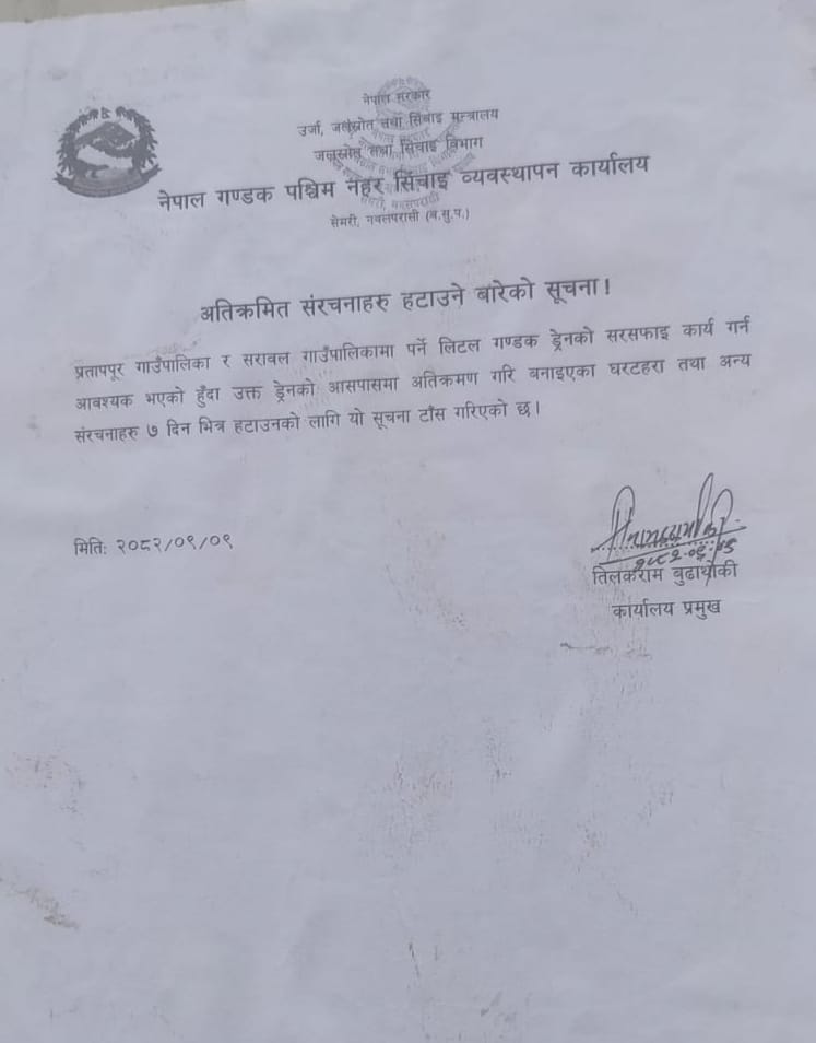 ब्यवस्थापन कार्यालयद्धारा लिटिल गण्डक ड्रेन अतिक्रमण गरि बनाइएको विभिन्न घर टहरा, तथा अन्य संरचनाहरु ७ दिन भित्र खाली गर्न गराउनका लागि सरावल र प्रतापपुर गाउपालिकालाई आग्रह गर्दै सार्वजनिक सुचना समेत जारी गरिएको छ । २०८२ पुस ९ गते नै सार्वजनिक रुपमा सुचना जारी गरिएको छ, प्रतापपुर ३ का स्थानिय समाजसेवी निवास यादवले भने, यो सुचना स्वागत योग्य छ । पालिका र स्थानियले अतिक्रमित संरचना खाली गरि सहयोग गर्नु पर्छ । यसले लामो समय देखीको जनताको पर्खाइ पुरा हुने देखिएको छ । ब्यवस्थापन कार्यालयका प्रमुख तिलकराम बुढाथोकीद्धारा जारी सुचना प्रतापपुर र सरावल गाउपालिकामा समेत बुझाइ सकिएको यादवले जनाए ।«
